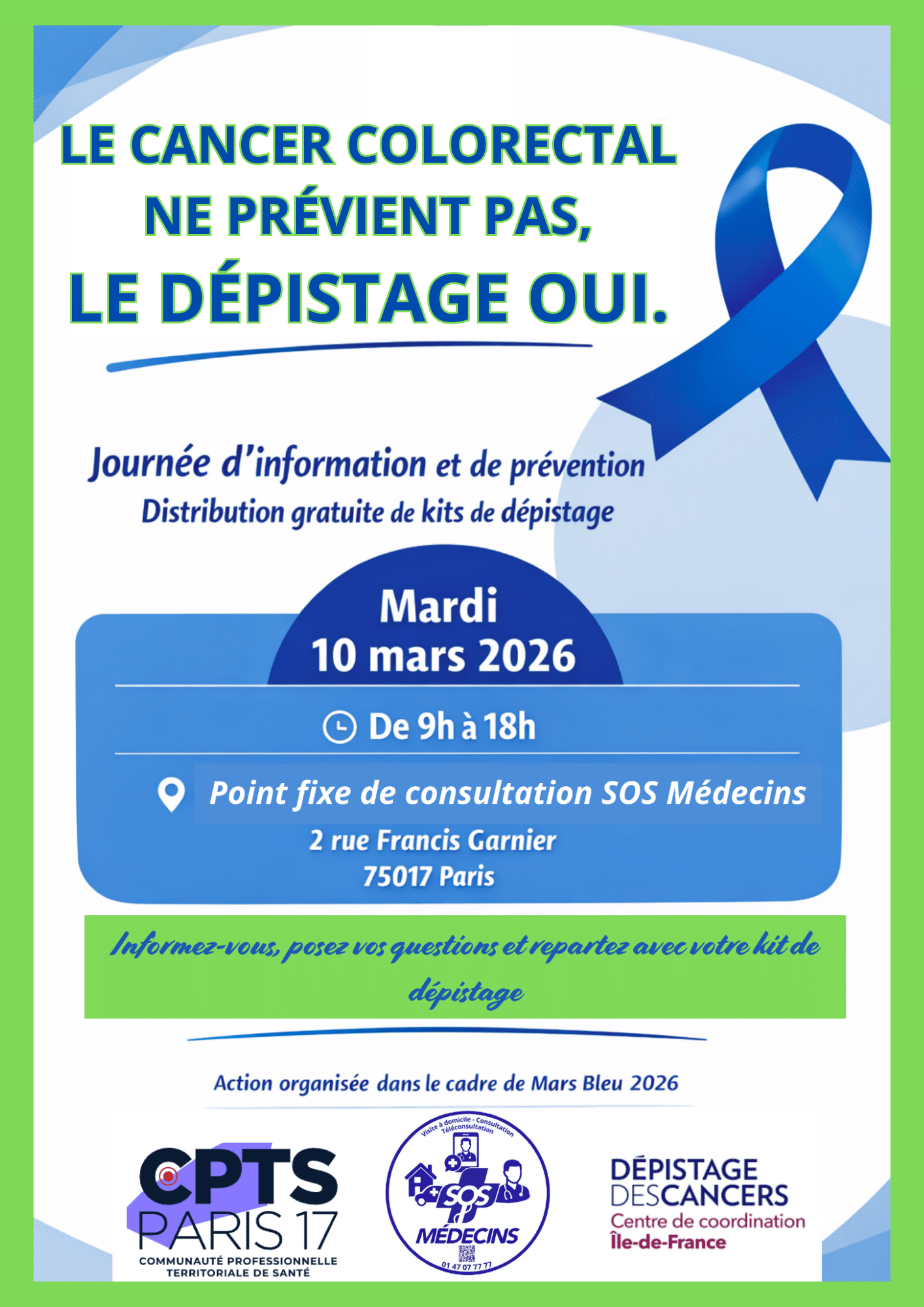 Journée d’information et de prévention du cancer colorectal – distribution de kits de dépistage
